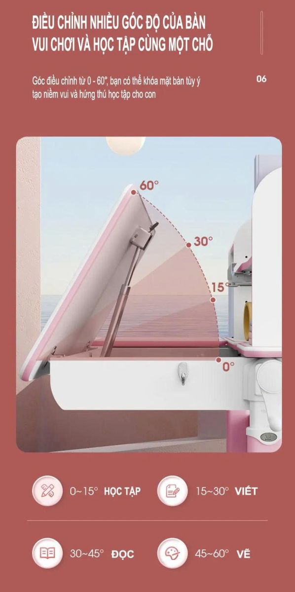 - Chế độ bàn: Nâng hạ chiều cao mặt bàn 540-780mm; điều chỉnh độ nghiêng mặt bàn từ 0-60.