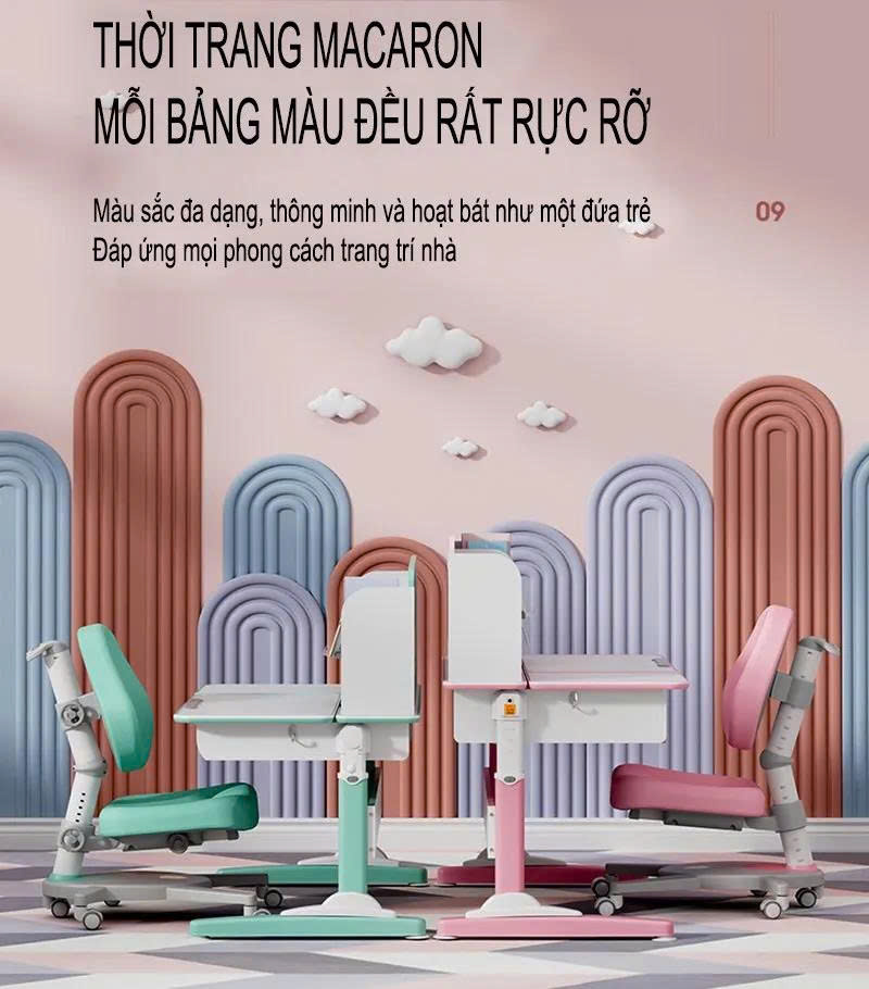 - Phụ kiện: Kệ sách, ngăn bàn, chặn sách, khay để sách/ipad, móc treo cặp, tay quay nâng hạ.