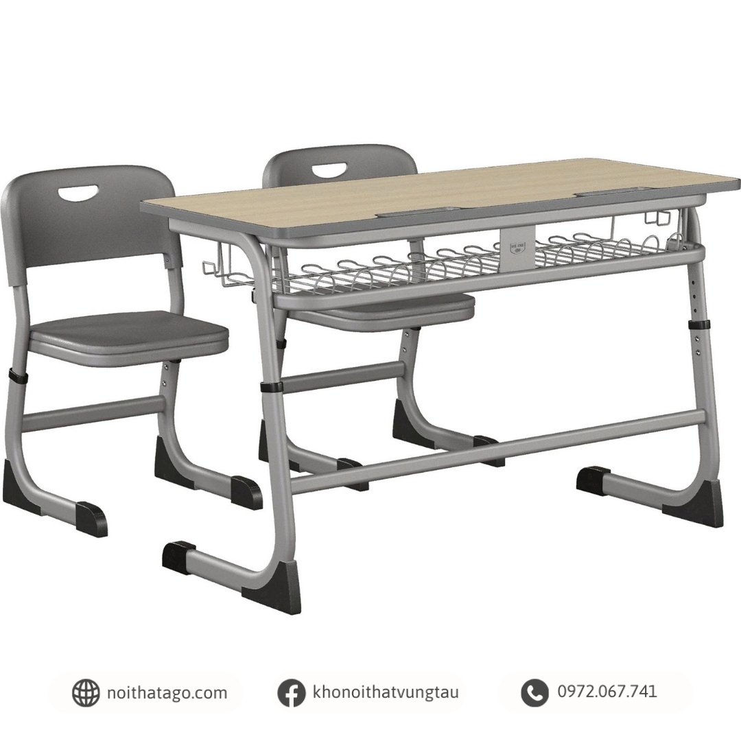 Bàn học sinh 2 chỗ ngồi với khung thép sơn tĩnh điện màu ghi, kết hợp với mặt bàn bằng gỗ công nghiệp, được viền ép nhựa cùng tông màu ghi. Bàn có khả năng điều chỉnh chiều cao linh hoạt, phù hợp với nhu cầu sử dụng đa dạng, mang lại sự thoải mái cho học sinh trong quá trình học tập.