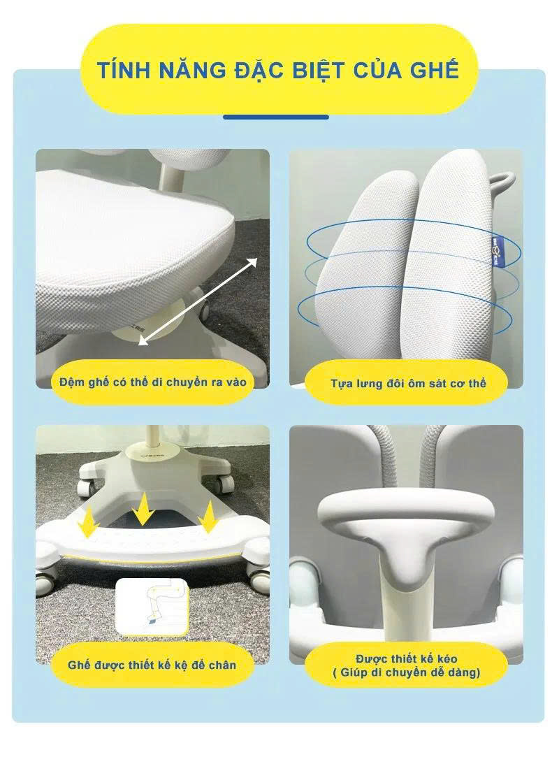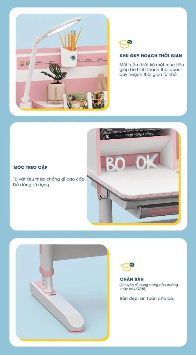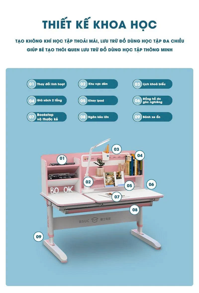 - Phụ kiện: Kệ sách, ngăn bàn, giá đặt sách/ipad, chặn sách, móc treo cặp, đồng hồ hiển thị độ nghiêng, chân bàn có bánh xe di chuyển.