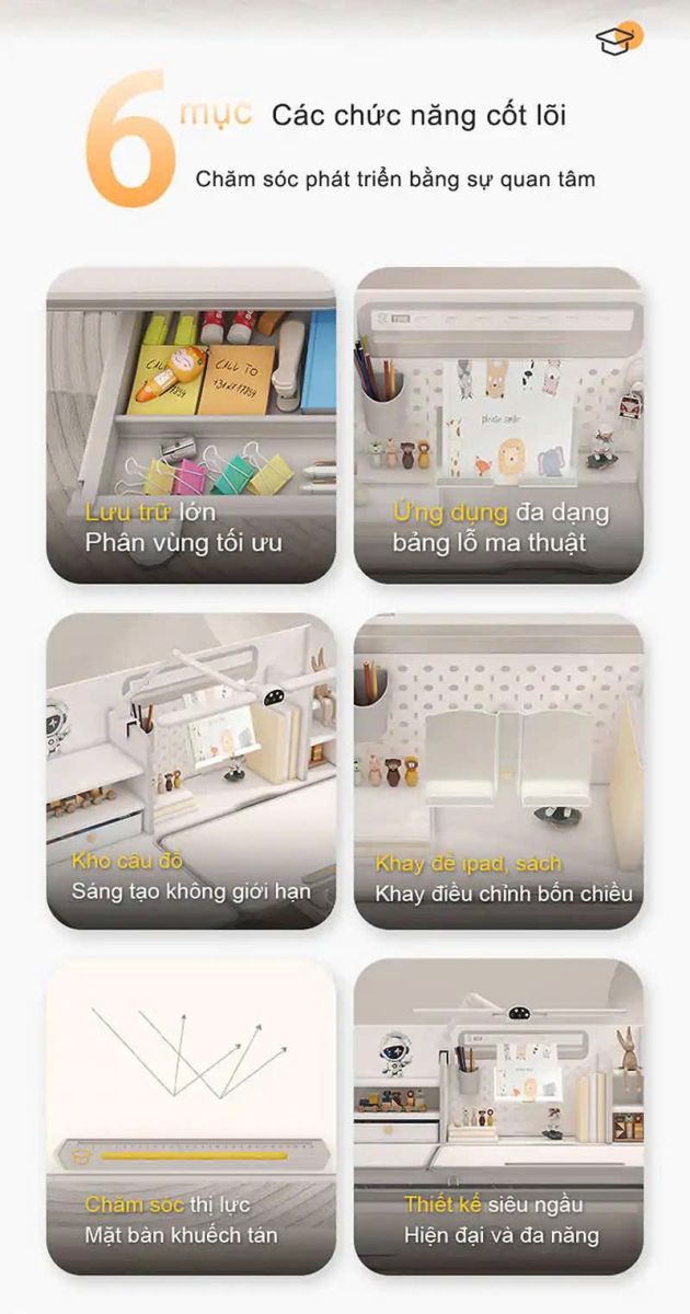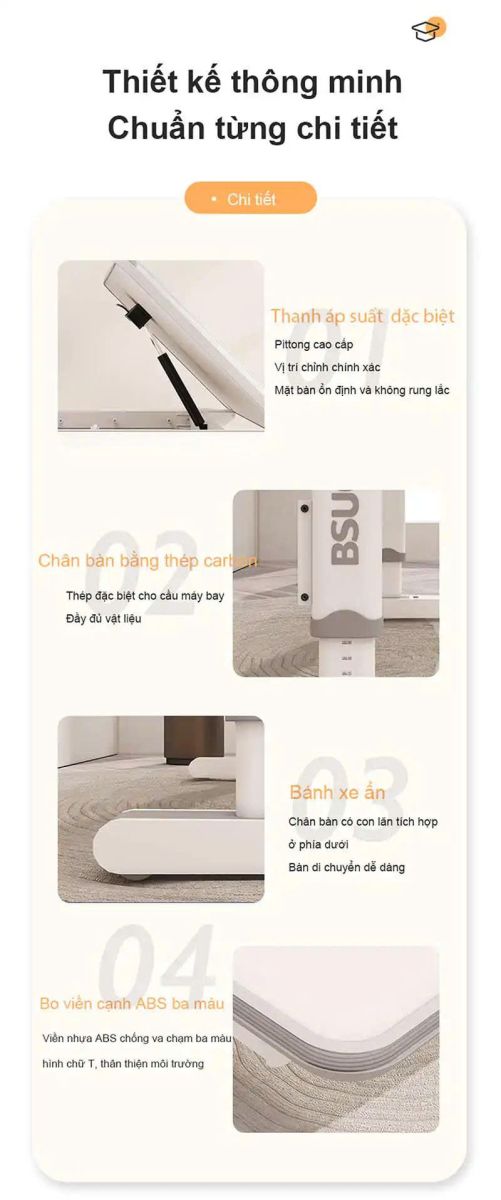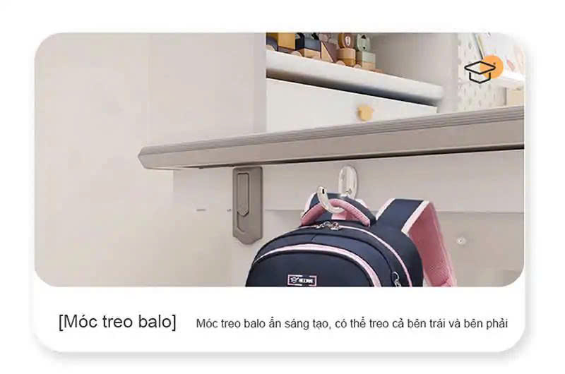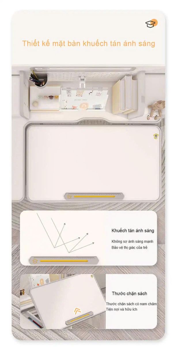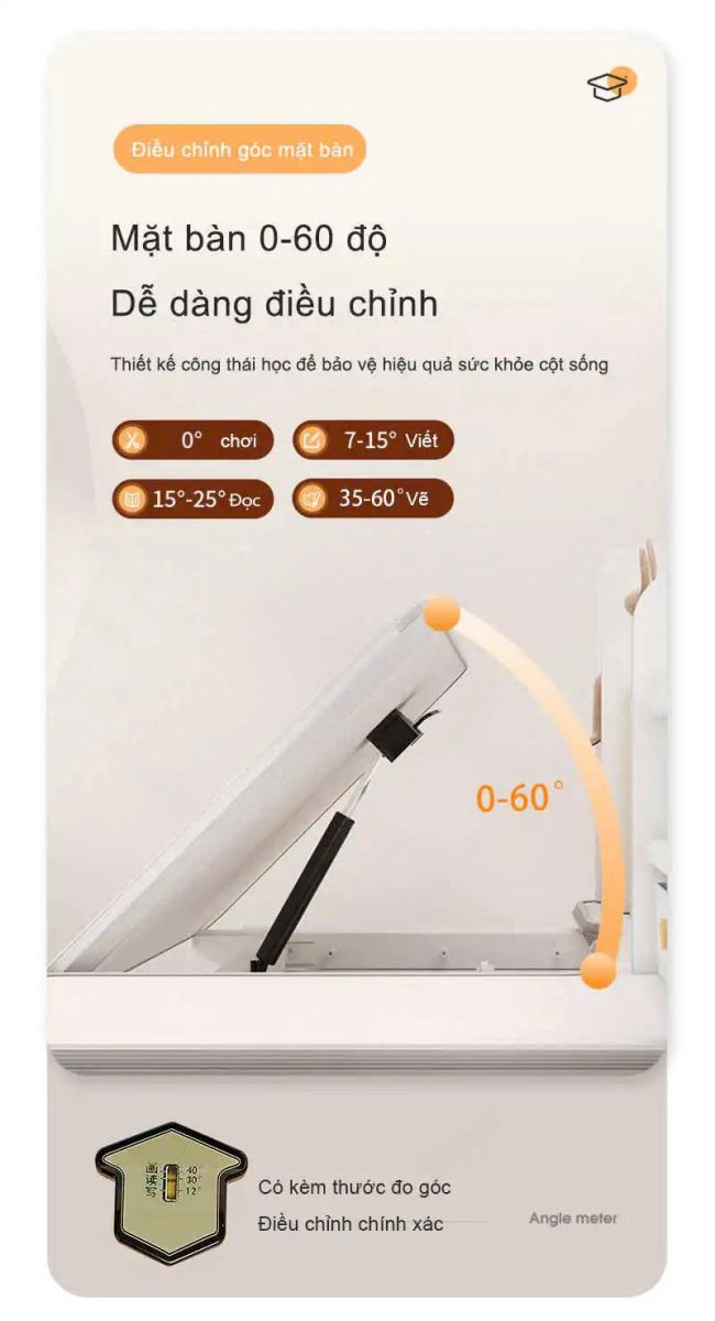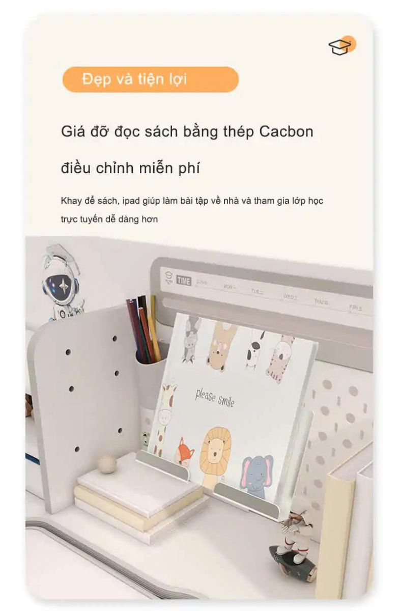 - Phụ kiện: Kệ sách, ngăn bàn, giá đặt sách/ipad, chặn sách, móc treo cặp, đồng hồ hiển thị độ nghiêng, chân bàn có bánh xe di chuyển.