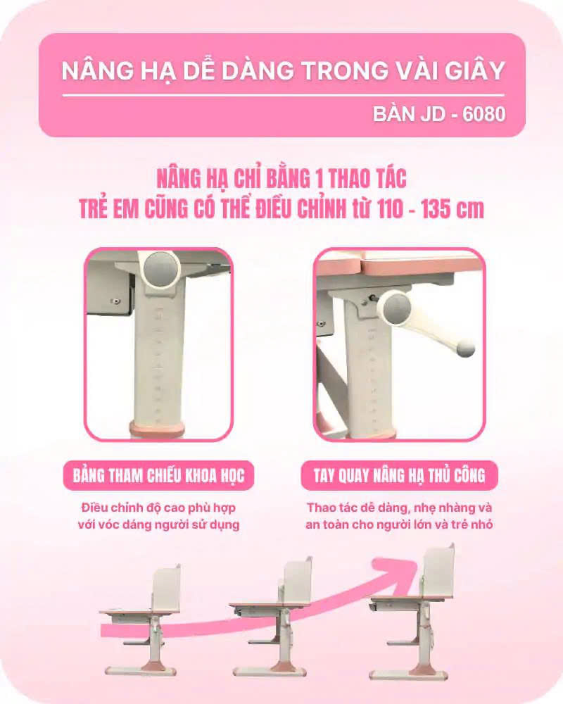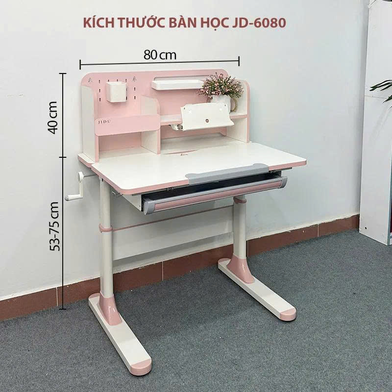 Bàn học thông minh JD-6080 được thiết kế với khả năng điều chỉnh độ cao mặt bàn từ 53cm đến 75cm, giúp bàn dễ dàng thích nghi với sự phát triển chiều cao của trẻ. Nhờ vào tính năng này, bàn học có thể được nâng lên hoặc hạ xuống để phù hợp với vóc dáng của trẻ mà không cần thay đổi bàn mới khi trẻ lớn lên. Trẻ có thể tự điều chỉnh độ cao mặt bàn bằng trục quay bên hông, giúp việc điều chỉnh trở nên dễ dàng mà không cần sự giúp đỡ từ người lớn.
