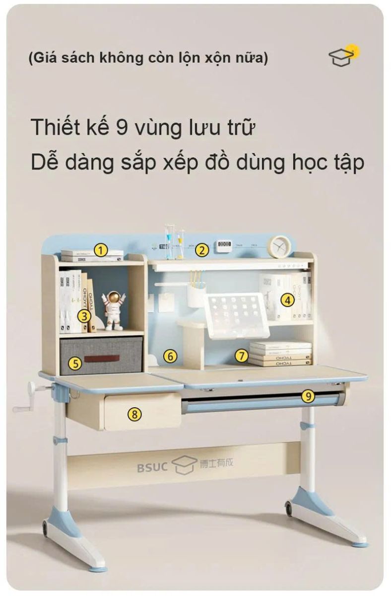 - Phụ kiện: Bàn tích hợp đèn chống cận, kệ sách, ngăn bàn, giá đặt sách/ipad, chặn sách, móc treo cặp, đồng hồ hiển thị độ nghiêng, chân bàn có bánh xe di chuyển.