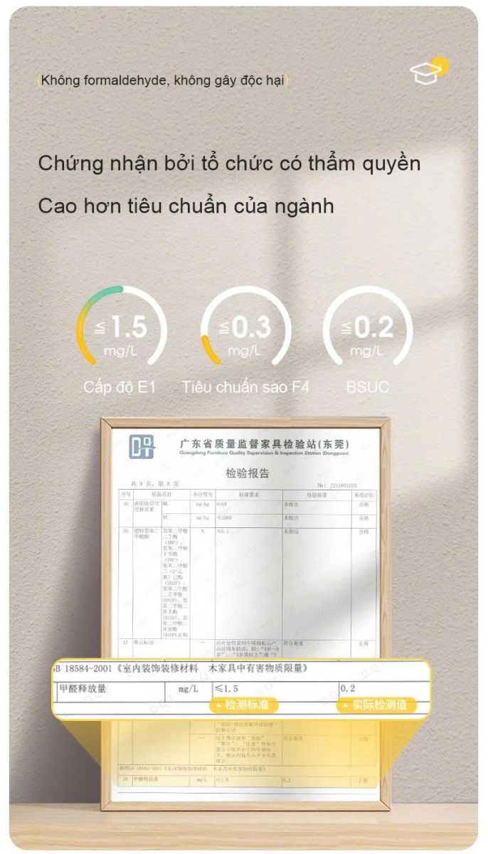 - Chất liệu: Gỗ công nghiệp cao cấp phủ Formica cốt gỗ tự nhiên, thép chống gỉ Baosteel, nhựa ABS không mùi, thân thiện môi trường, ghế sử dụng đệm hàng không, vải nỉ 3 lớp thoáng khí.