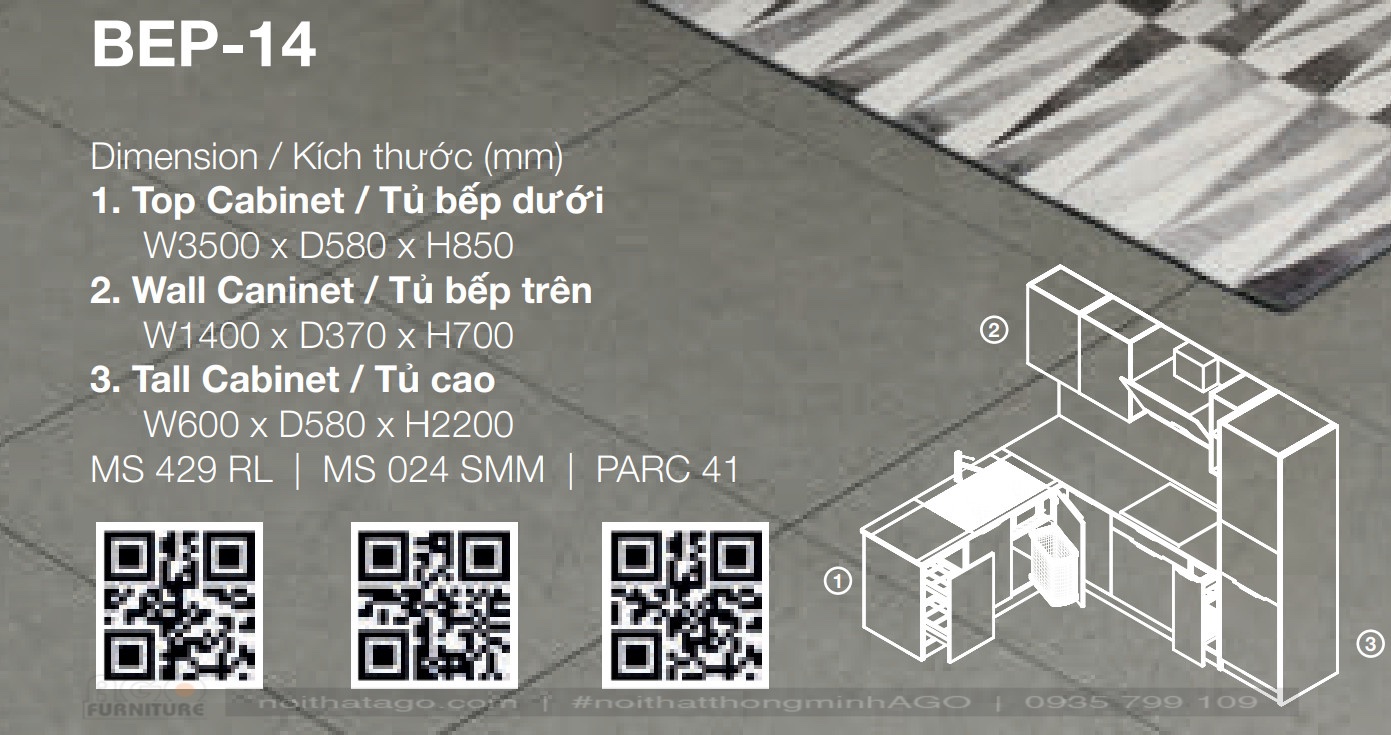 Bộ tủ bếp Nội Thất AGO muốn giới thiệu đến bạn bao gồm tủ bếp dưới, tủ bếp trên và tủ cao với các kích thước như sau: