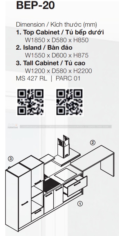 | Tủ bếp dưới | W1850 x D580 x H850 |
