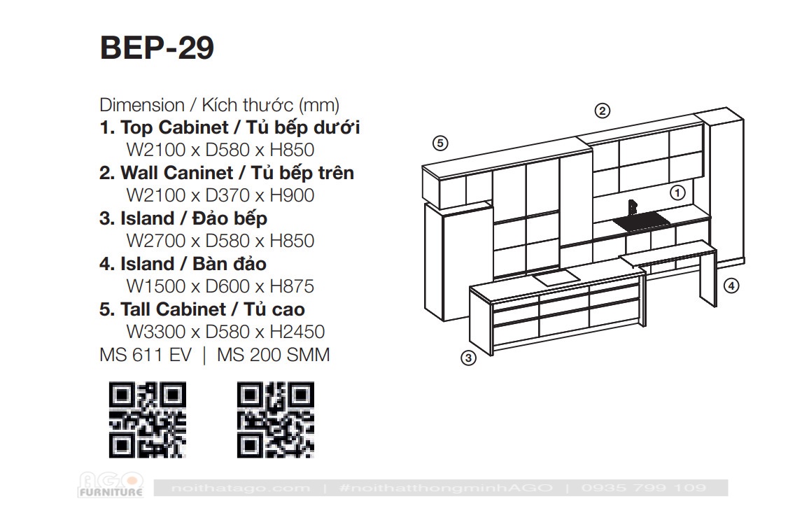 Tủ có kích thước lớn tạo được không gian bên trong tủ rộng rãi, dễ dàng sắp xếp đồ dùng. Dưới đây là bản kích thước cụ thể của tủ bếp dưới, tủ bếp trên, đảo bếp, bàn đảo và tủ cao mà nội thất Ago cung cấp đến cho bạn.