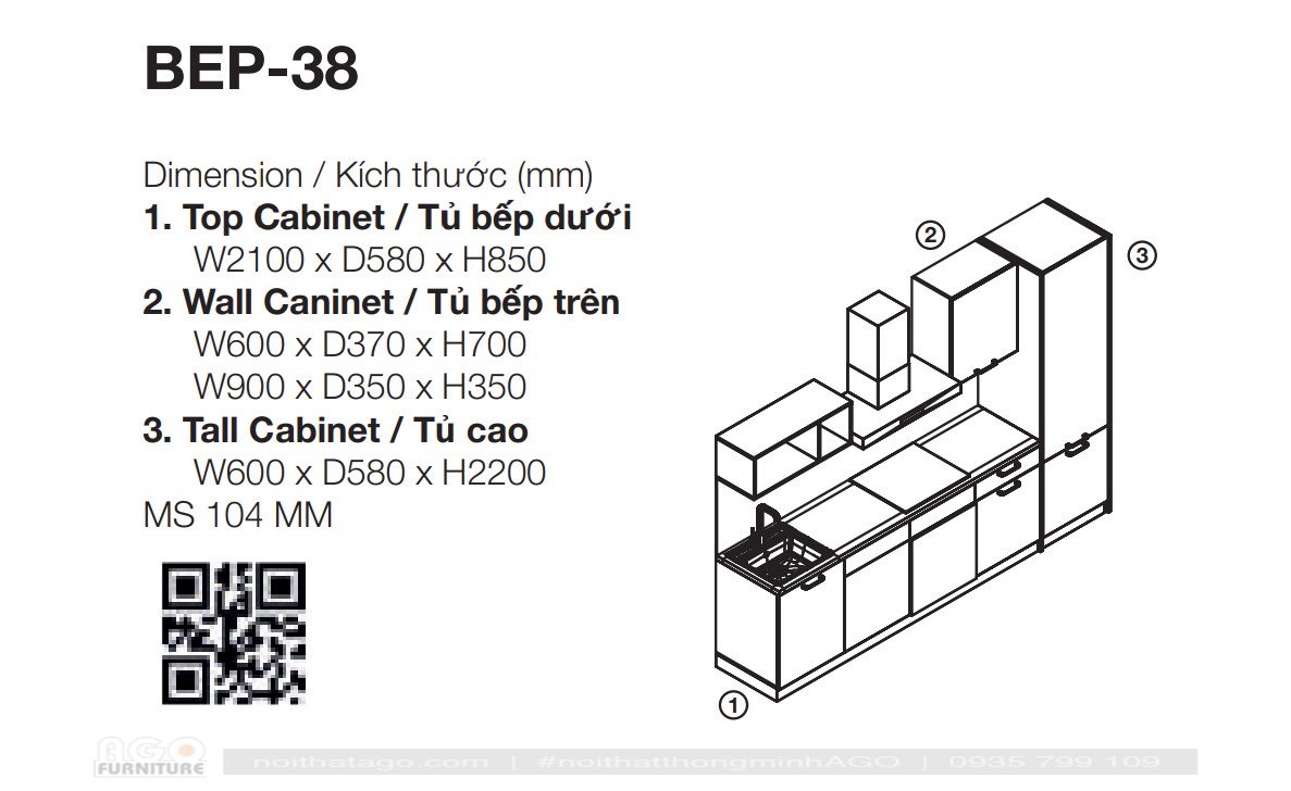 Nếu gia đình bạn không có quá nhiều không gian cho căn bếp của mình thì nội thất của chúng tôi được lắp đặt với kích thước W2100 x D580 x H850. Đây là kích thước không chiếm quá nhiều không gian đồng thời phù hợp trong việc đựng những vật dụng cần thiết.