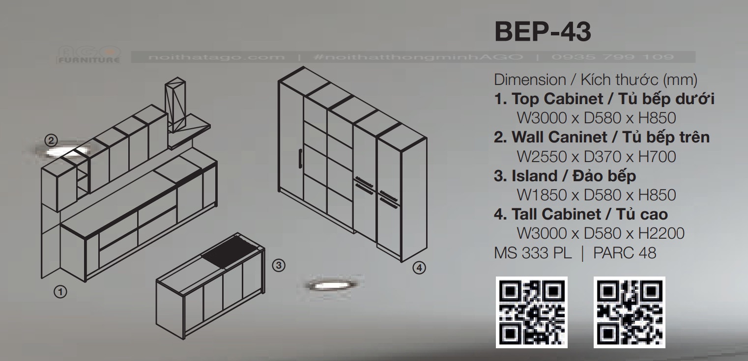 Tủ bếp bên Nội thất Ago cung cấp đến cho bạn bao gồm tủ bếp dưới, tủ bếp trên, đảo bếp và tủ cao với các thông số cụ thể như sau: