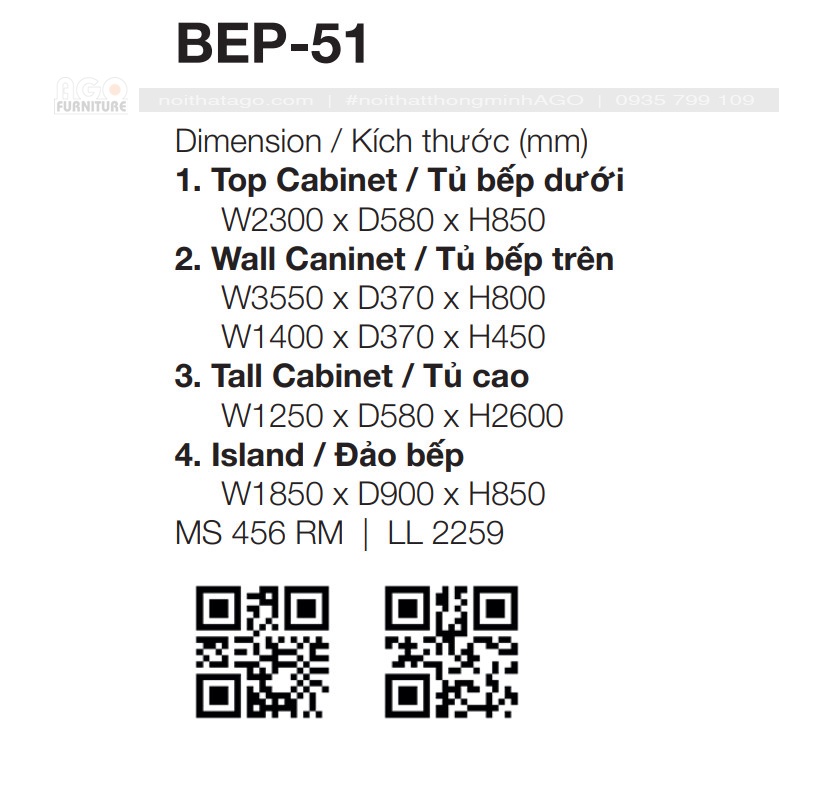| Tủ bếp dưới | W2300 x D580 x H850 |