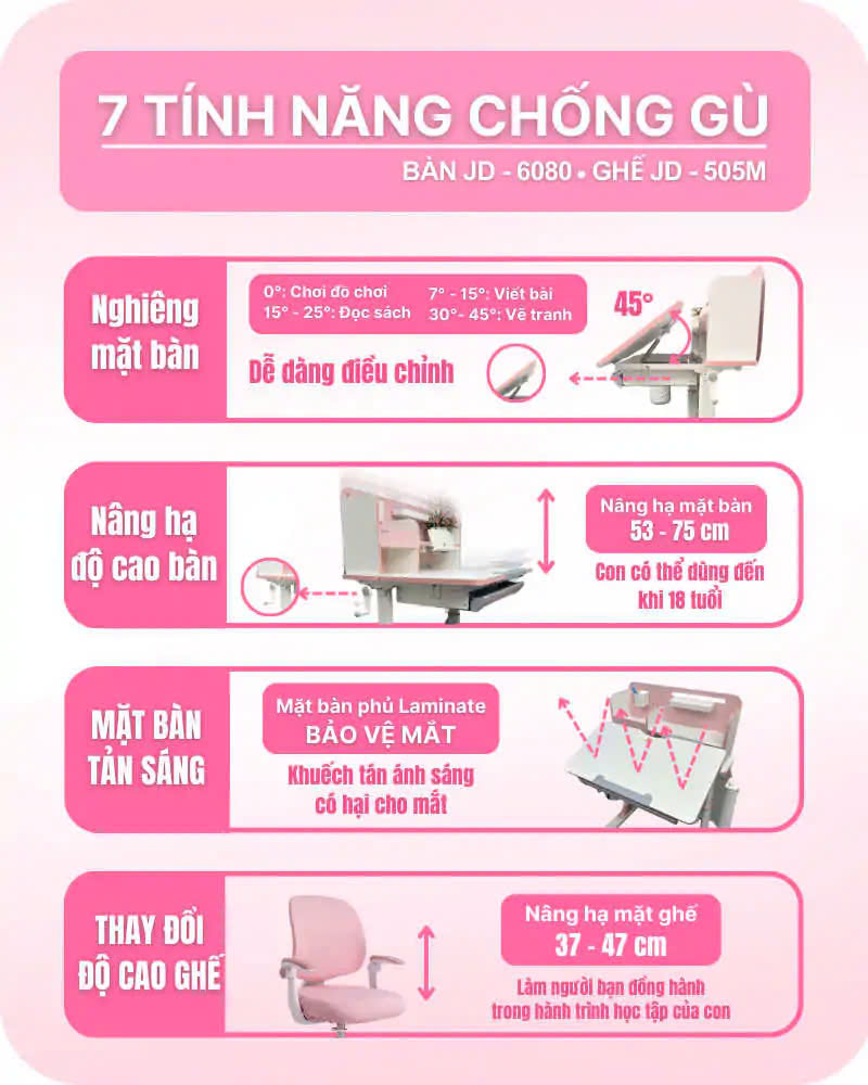 Bằng cách duy trì tư thế ngồi học đúng đắn và ngăn ngừa các vấn đề về sức khỏe, bàn học JD-6080 không chỉ giúp cải thiện hiệu suất học tập mà còn bảo vệ sức khỏe của trẻ một cách hiệu quả. Đây là sự đầu tư đúng đắn cho sự phát triển toàn diện của trẻ trong giai đoạn học tập.