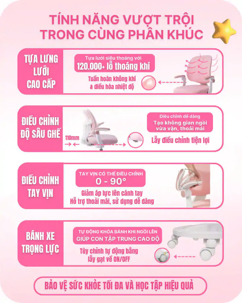 Chức năng hỗ trợ sức khỏe: Sản phẩm được trang bị các tính năng chống gù lưng và chống cận thị, giúp ngăn ngừa các bệnh lý học đường phổ biến như gù lưng và cận thị, đảm bảo sức khỏe lâu dài cho trẻ.