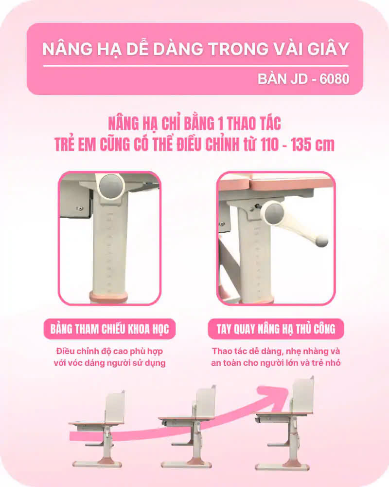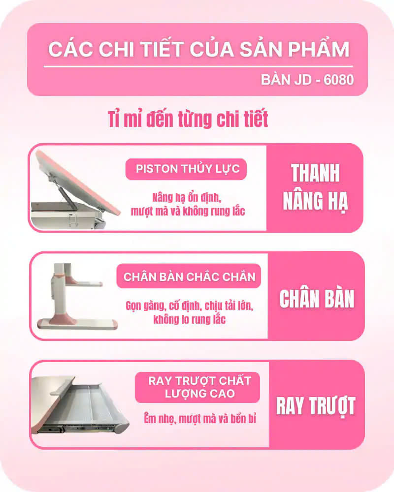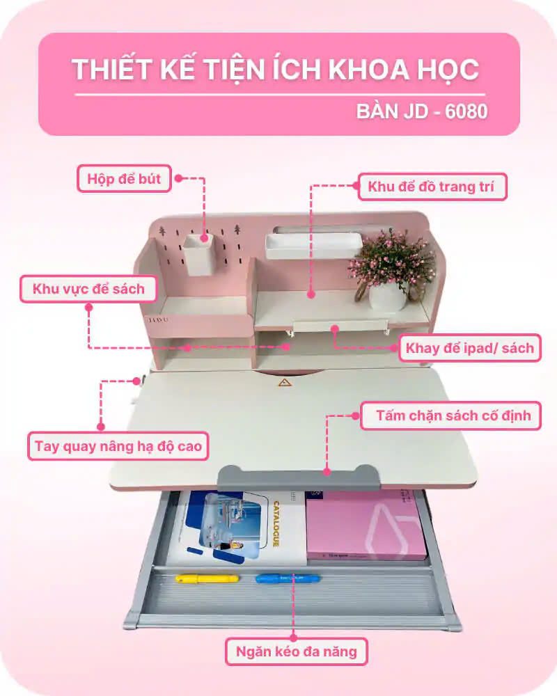 Bàn học thông minh JD-6080 là một sản phẩm có các tính năng hỗ trợ toàn diện cho trẻ em trong quá trình học tập. Thiết kế của bàn giúp duy trì tư thế ngồi học chuẩn suốt cả ngày, từ đó tạo ra một môi trường học tập thoải mái, hỗ trợ trẻ tập trung tốt hơn và nâng cao hiệu suất học tập.