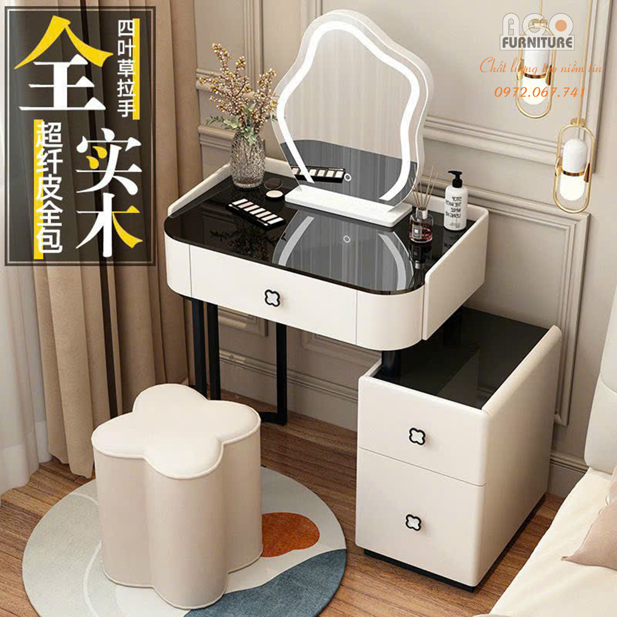 AGO Furniture là đơn vị chuyên cung cấp nội thất gia đình với đầy đủ các sản phẩm như bàn trang điểm, giường ngủ, bàn học, tủ quần áo,… trong đó Bàn phấn hiện đại nhập khẩu là một trong những sản phẩm đang được bán chạy nhất tại cửa hàng của chúng tôi. Hãy liên hệ với AGO Furniture ngay hôm nay để nhận những ưu đãi tốt nhất.
