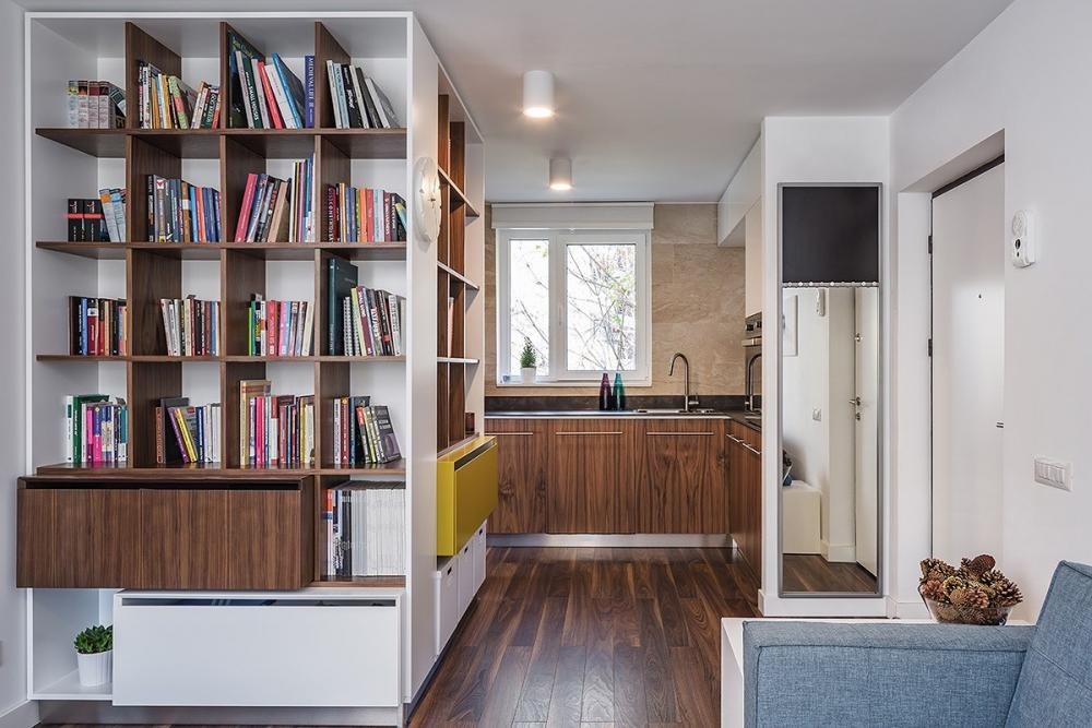 Giá sách vừa có chức năng lưu trữ, vừa là vật trang trí căn hộ đồng thời cũng là vách ngăn giữa nhà bếp với phòng khách.