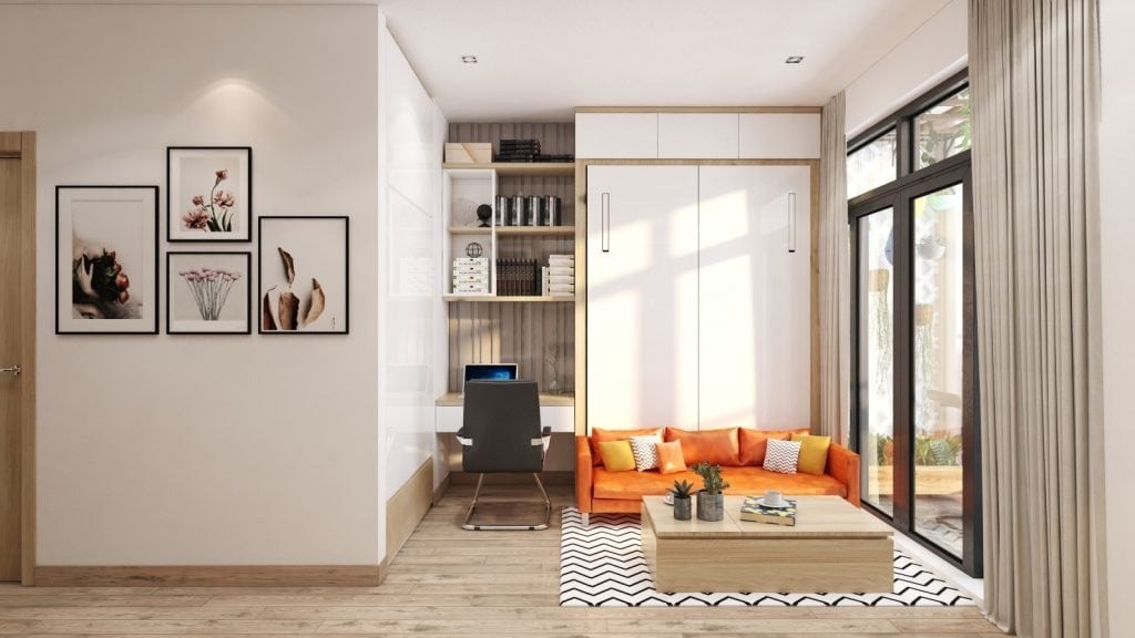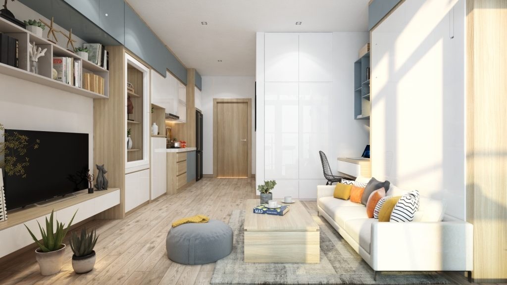 Căn hộ chung cư với có diện tích nhỏ do đó mà việc thiết kế tối ưu nhất là kiểu thiết kế thông phòng kết hợp sử dụng các đồ nội thất thông minh kiêm nhiêm nhiều chức năng khác nhau.