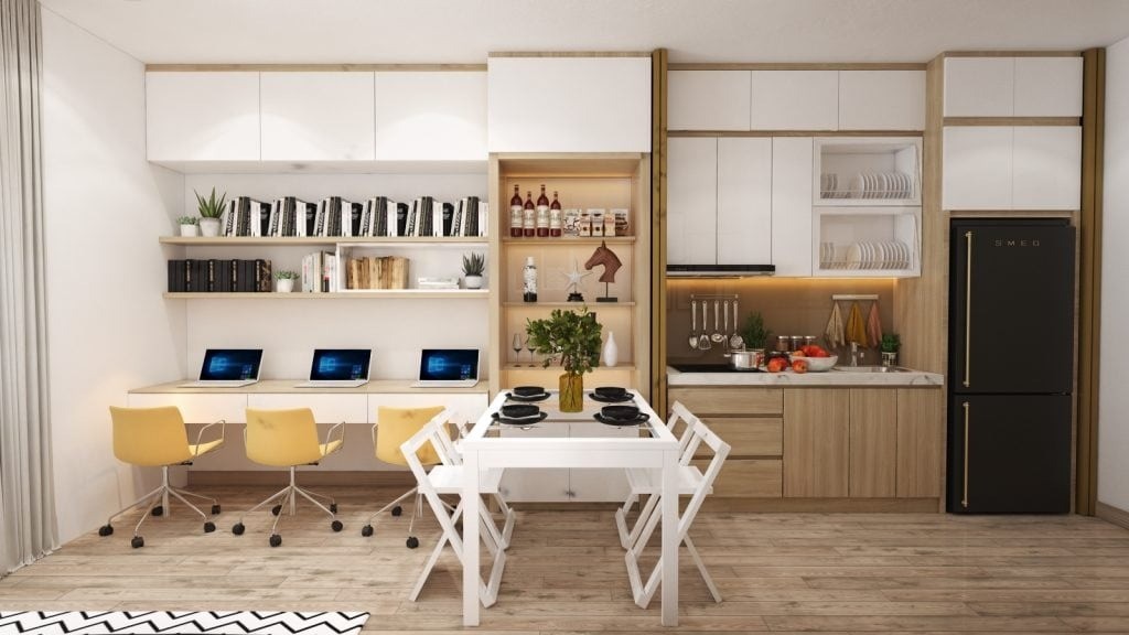Cùng với không gian đó khi được chuyển đổi công năng thành không gain phòng ăn hoàn hảo với hệ bàn ăn thông minh, Rèm che cùng được gấp gọn lại để lộ ra không gian bếp nấu ăn với đầy đủ tiện nghi. Một không gian bếp không quá rộng rãi. Tuy nhiên chính thiết kế hợp lí cùng việc bố trí đồ nội thất hài hòa chắc chắn sẽ khiến cho bất kì người nội trợ nào cũng cảm thấy hài lòng.