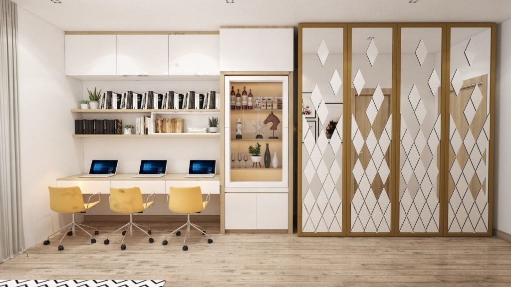 Với không gian làm việc hay Office – Văn phòng được thiết kế nhỏ gọn với khu làm việc dành cho 3 người với đầy đủ tiện nghi và tiện ích phục vụ cho công việc như hệ giá sách, tủ đựng tài liệu. Không gian phù hợp dành cho các nhóm làm việc với khoảng từ 3 đến 5 người làm việc.