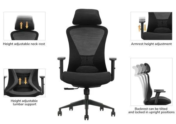 Phần lưng: Có thể điều chỉnh chiều cao với phần hỗ trợ thắt lưng tách biệt và linh hoạt