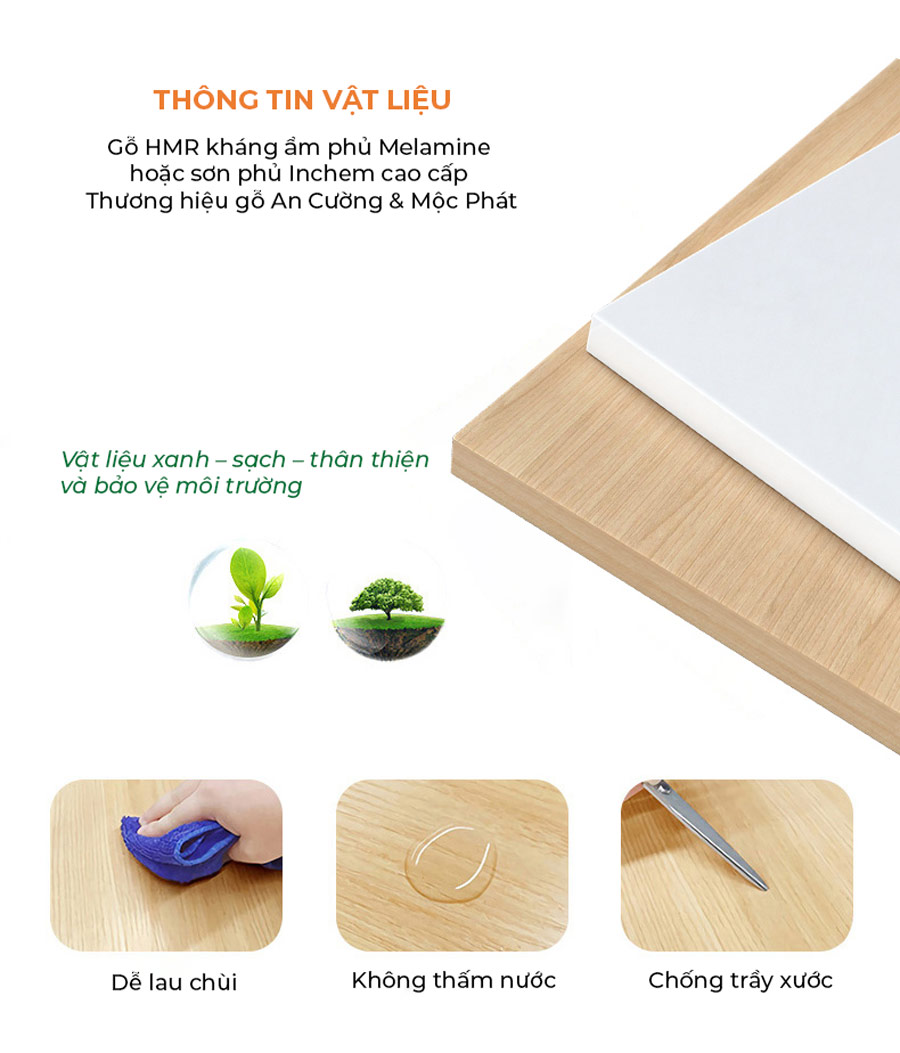 - Chất liệu: Gỗ công nghiệp MDF lõi xanh kháng ẩm, là loại gỗ có độ bền sử dụng trên 10 năm. Bề mặt được phủ melamine có khả năng chống trầy xước chịu nhiệt tốt và dễ dàng vệ sinh